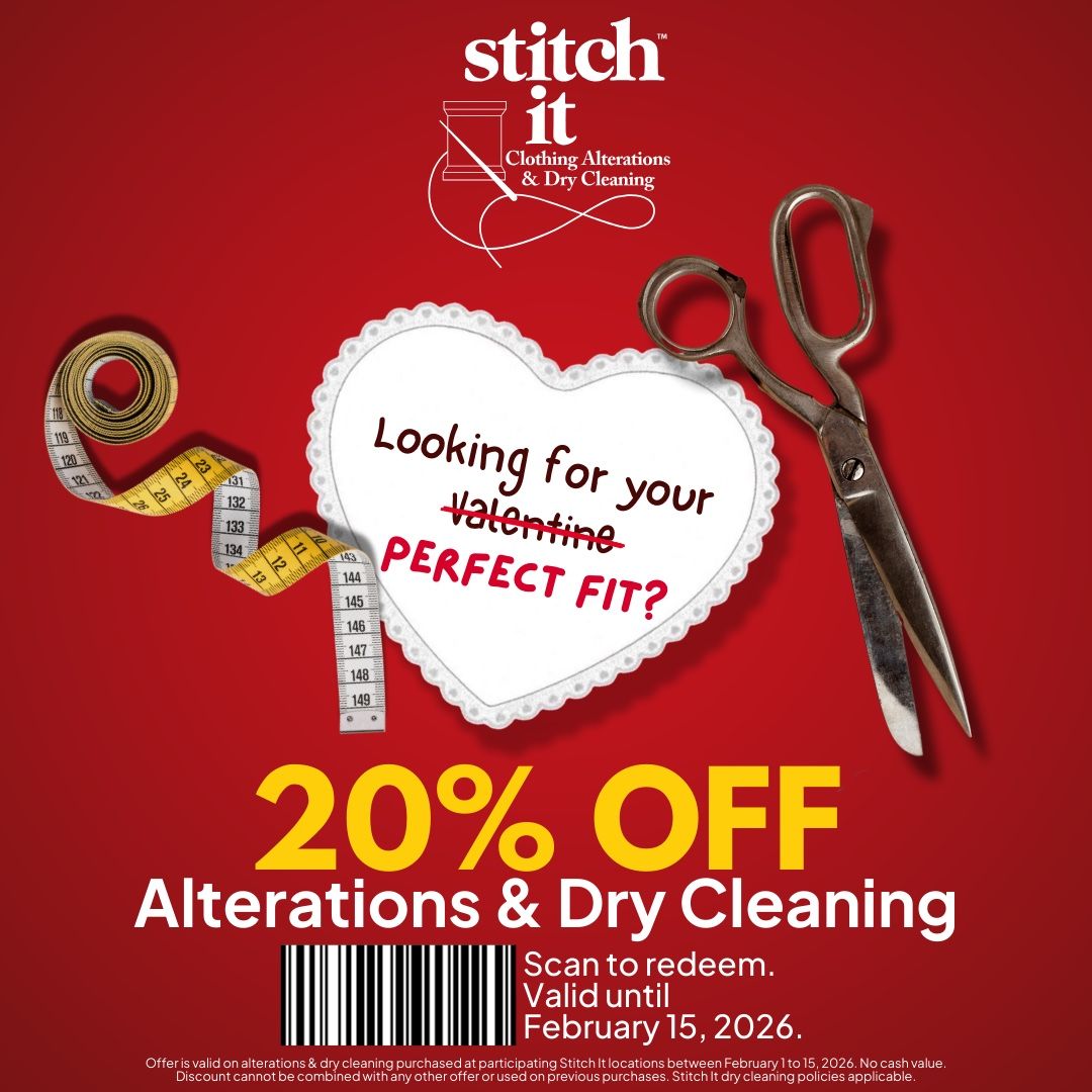 Sun, 1 Feb 2026 - Sun, 15 Feb 2026Looking for your perfect? Stitch It has you covered! Save 20% off alterations & dry cleaning from February 1st to 15th. Feeling confident in your clothing has never been easier, don't miss out! Conditions apply. See stitchit.com/deals for details.